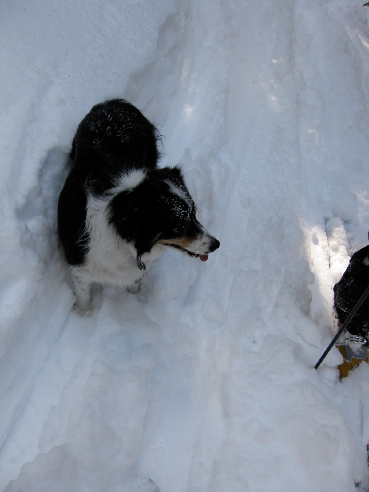 Jamie and I went out yesterday afternoon, after the crowds had died down and we had both gotten some working hours in, and skinned south of Mt. Glory. We saw two snowboarders, who we passed, and then we had the path and forest to ourselves. Such a magical time to be outside in the mountains, the light slowly waning and casting shadows. Because it is spring, the snow was light in places and heavy in others, conditions that made it rough for little dog. But she likes a challenge.